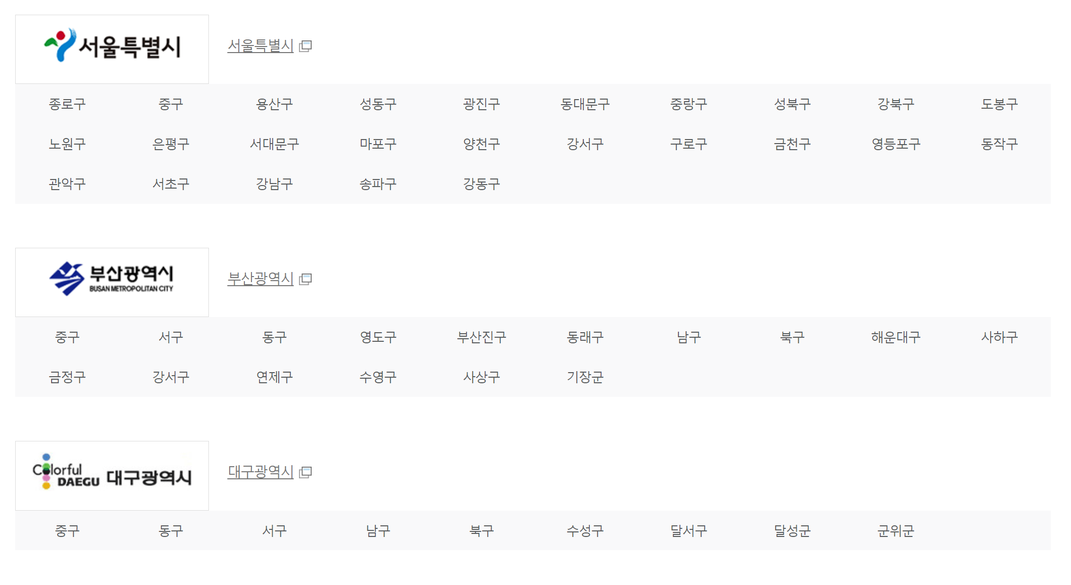 아래주소로 들어가시면, 각 지자체 '시' , '구' 별 홈페이지로 빠르게 들어가 보실 수 있습니다.