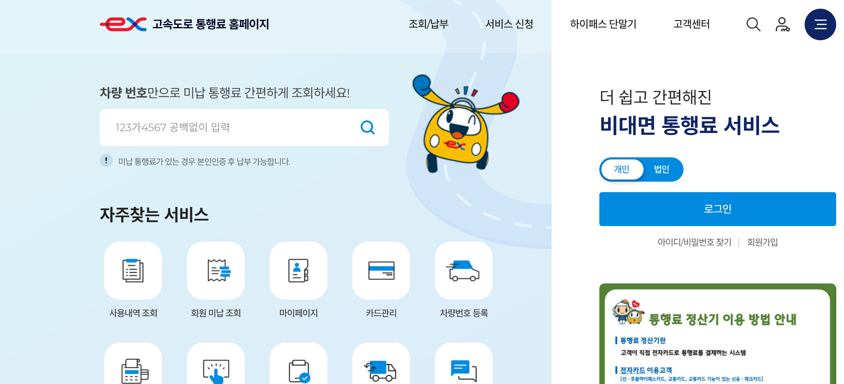 차량 번호만으로 미납 통행료 조회가 가능하고 바로 납부하시면 됩니다.
