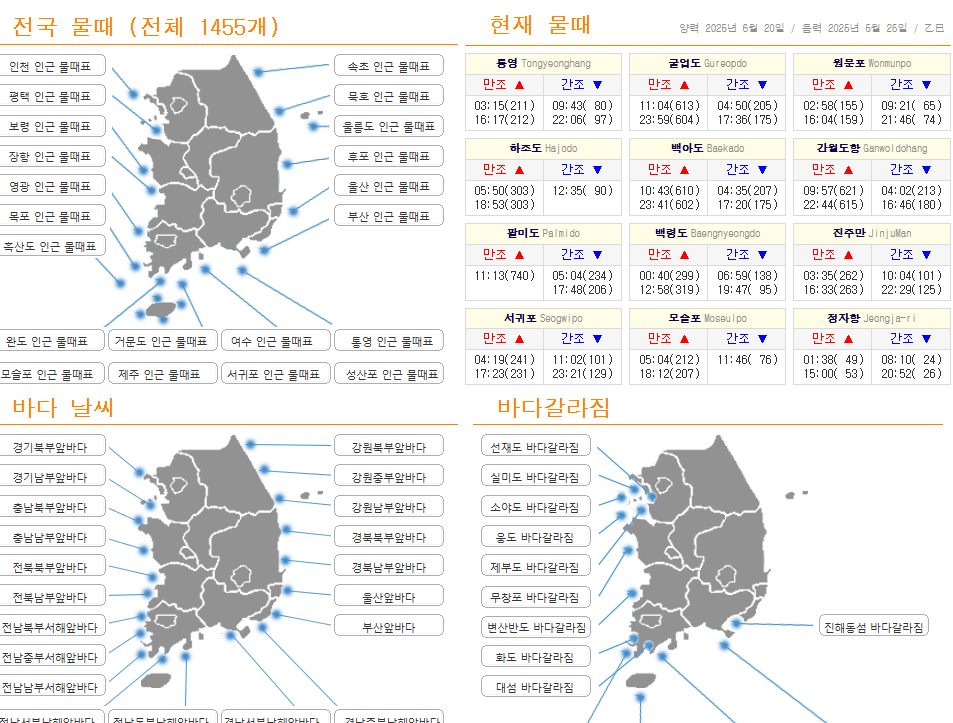 - 물때표는 과거/미래 모두 확인 가능하며, 월간·연간 물때표로 여행·체험 일정을 미리 계획할 수 있습니다.