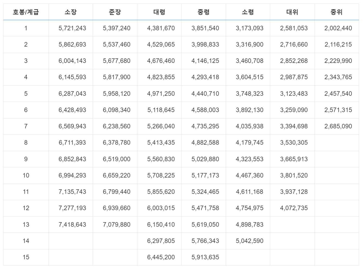 2024 군인 월급 - 장교 봉급표